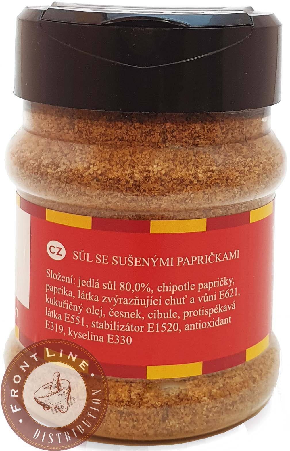 Toto dymové korenie kombinuje zemitú korenitosť údených chipotle papričiek s chrumkavou chuťou všetkej prírodnej tichomorskej morskej soli. Táto soľ vyrobená zo skutočných papričiek jalapeno sušených v dyme a lahodná ako jej menovec, má bohatú chuť praženej papriky, ktorá prináša na stôl štipku fiesty. Vítaný prírastok do nášho radu ochutených solí dodáva sodíku iskru tepla zmiešaním nerafinovanej soli s mexickým chilli chipotle. Výsledkom je nádherná tehlovo červená soľ, ktorá vyzerá tak atraktívne a chutí tak dobre! Dymové teplo chipotle naozaj vynikne bez toho, aby bolo prehnané. Zloženie: Jedlá soľ 80%, chipotle papričky, paprika, látka zvýrazňujúca chuť a vôňu E621, kukuričný olej, cesnak, cibuľa, protispeková látka E551, stabilizátor E1520, antioxidant E319, kyselina E330 Použitie: Táto korenená a dymová morská soľ chipotle je lahodná, pridáva sa k slaným pokrmom, ako je kuracie mäso alebo ryby, alebo sa použije ako soľ do sladkých dezertov, ako je čokoláda, puding. Obsah balenia: 180 g Krajina pôvodu: USA