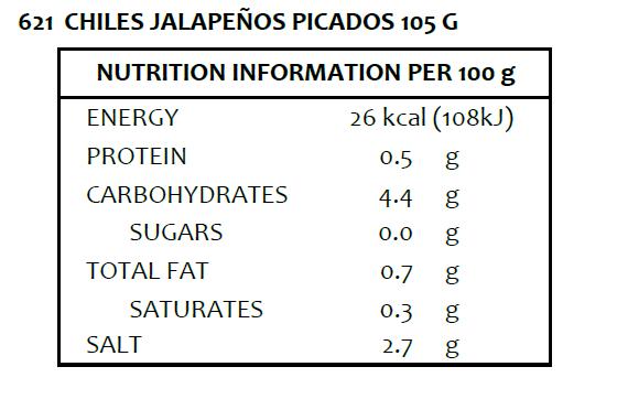 Najznámejšie mexické papričky Jalapeno, krájané na kocky na zdobenie mexických jedál. Ľahko pálivé papričky, ktoré dodajú vášmu pokrmujemnú pikantnosť a farbu. Zloženie: Jalapeno chilli krájané na kocky, voda, ocot, soľ, cibuľa, rastlinný olej a korenie Použitie: Zaobstarajte si tieto prezentácie plátkov plných kyslej a pikantnej chuti, ktoré sú ideálne pre vytvorenie veľkolepého občerstvenia, ktoré sa skvele hodia na akúkoľvek akciu a urobia z vás ideálneho hostiteľa. Plechovka vo vašej skrini je nenahraditeľná, nikdy neviete, kedy ich budete potrebovať. Čerstvé jalapeno môžete použiť do sals. Tiež sú vynikajúce v polievkach, dusených pokrmoch alebo na pizze a hamburgeroch. Obsah balenia: 105 g Krajina pôvodu: Mexiko